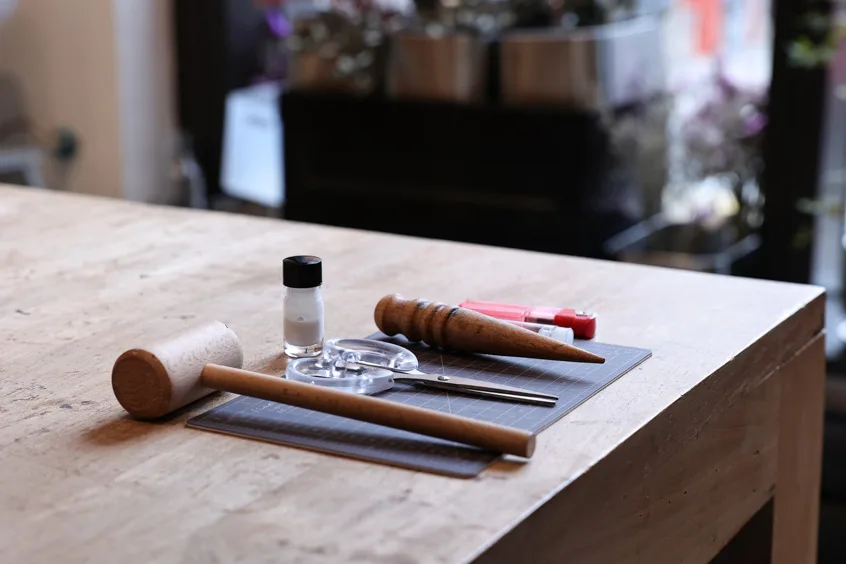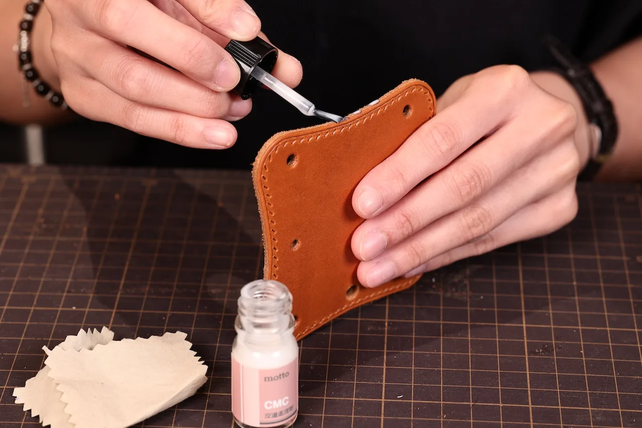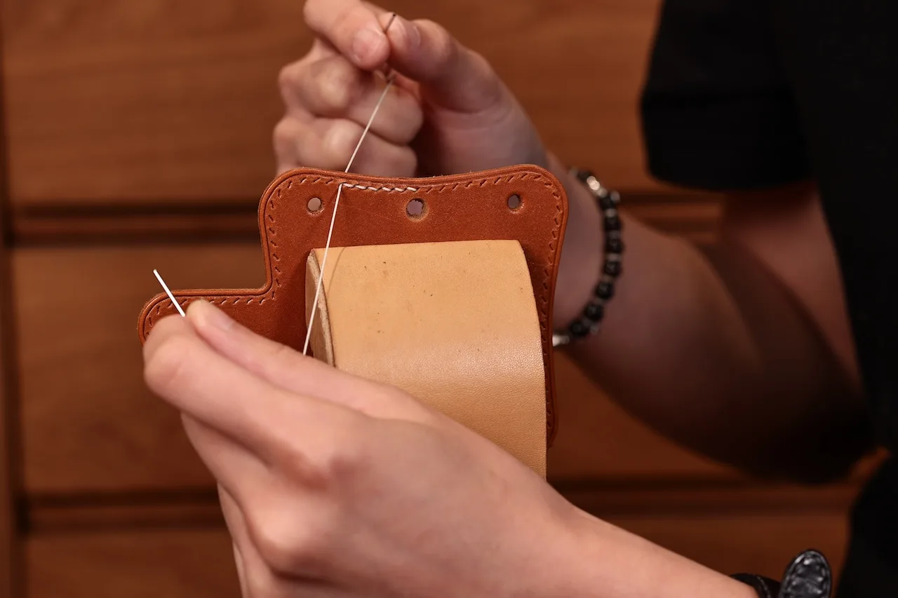 法式打斬(法國vergez blanchard 法斬3.38mm)、馬鞍針法 雙面縫針、貼合皮革、磨邊染邊處理