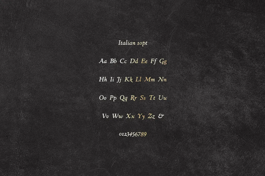 Italian字體斜體傾斜、結構平衡、曲線流暢、細節精緻和字母連接,展現出一種古典、優雅且精心設計的風格。