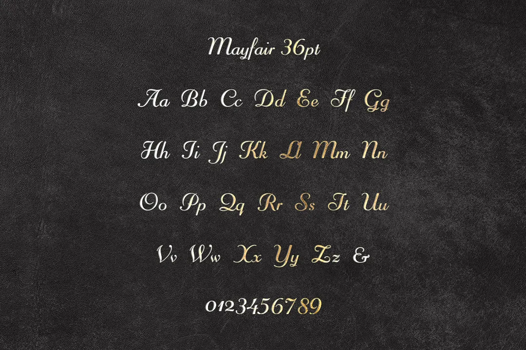 Mayfair字體以其曲線優雅、線條細膩、高度變化、裝飾性元素和空間利用等特點,展現出一種華麗、優雅且精心設計的風格。