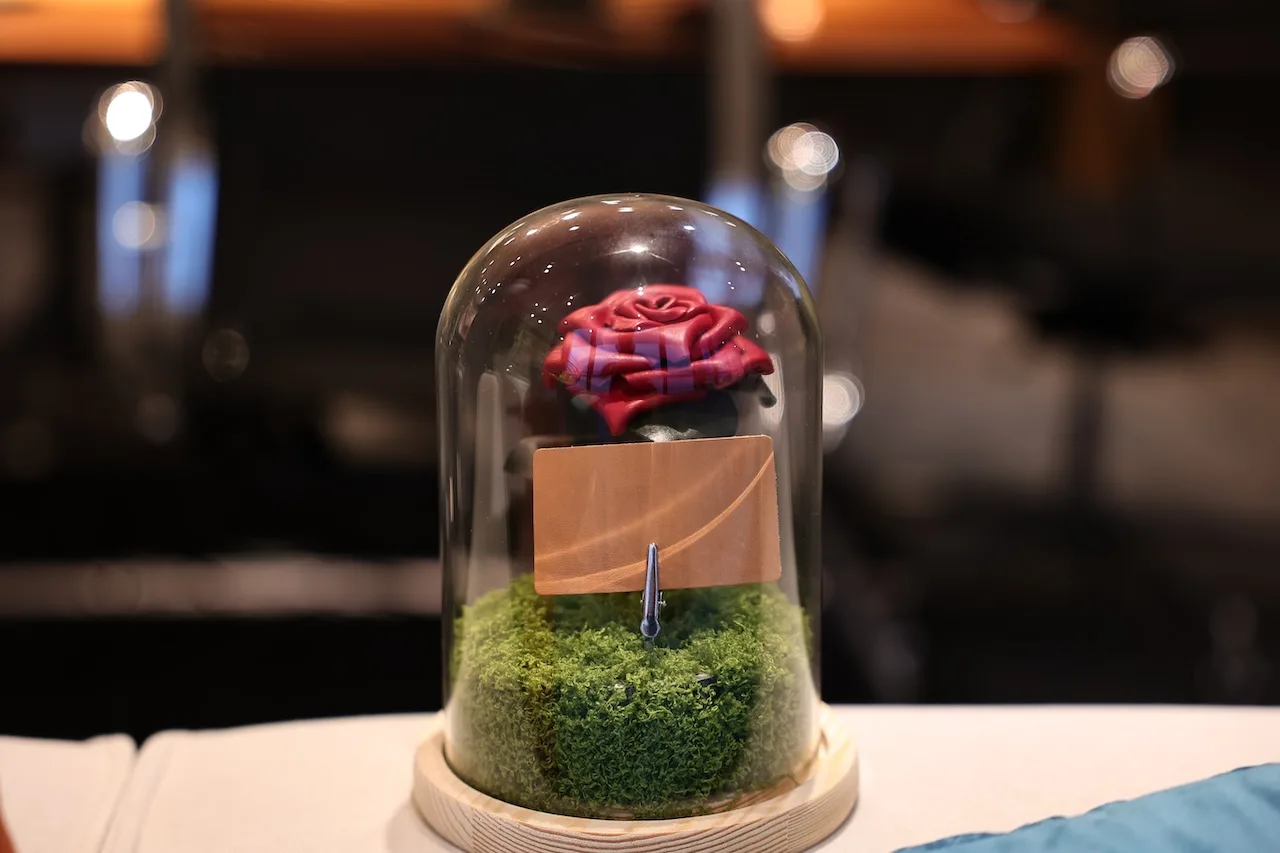 – Attached is a leather card, guests can type or handwrite their own message