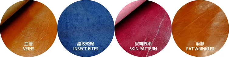 植鞣牛皮的皮膚紋路、毛孔、筋脈、血管及蟲咬班點會分佈在整張牛皮上。這樣的生長紋顯現牛皮的自然性,及不重複性,更見皮具的生命力。