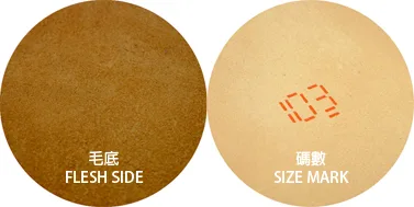 為完全呈現牛皮的天然質感,我們不會加入內襯裡布,因此天然皮革毛底會完全顯露。而標示牛皮大少的碼數,亦可能會出現在某些皮部件。