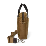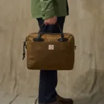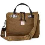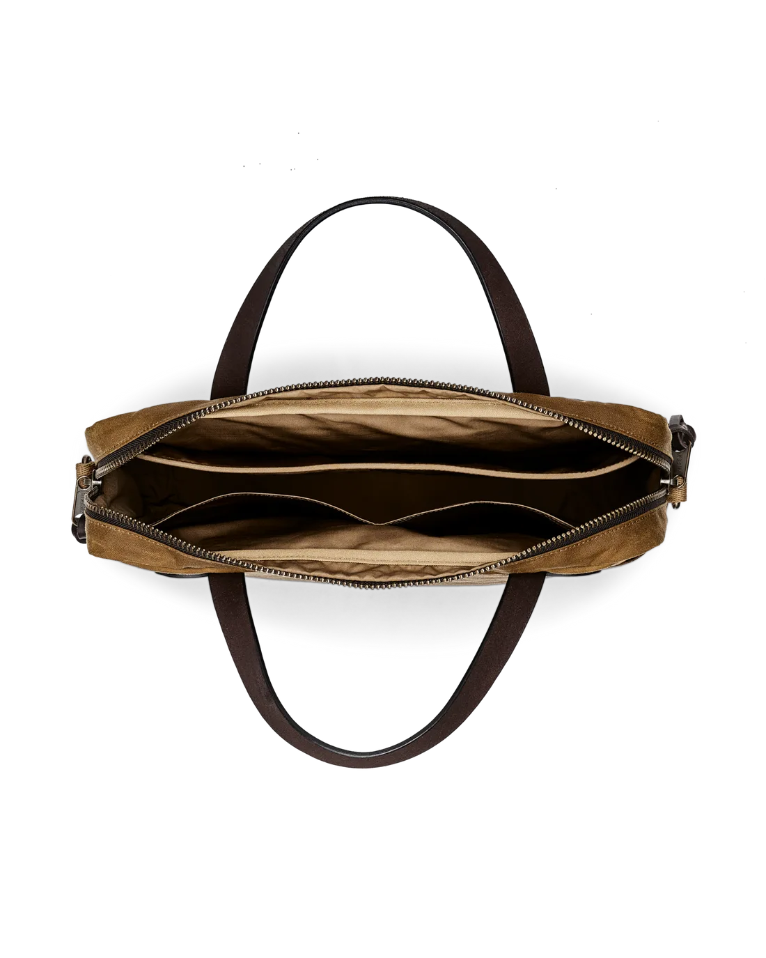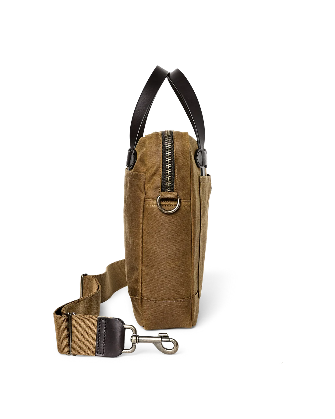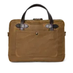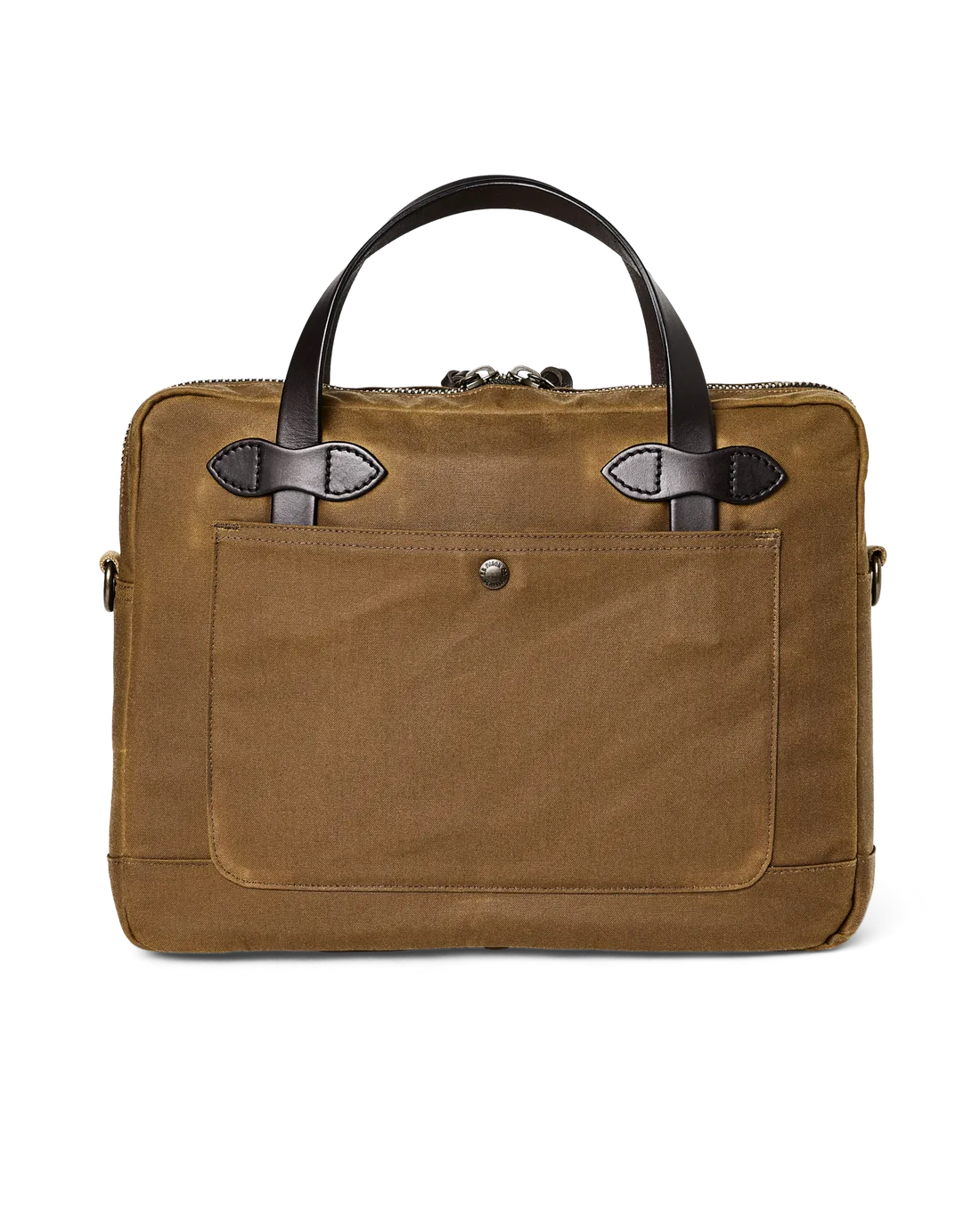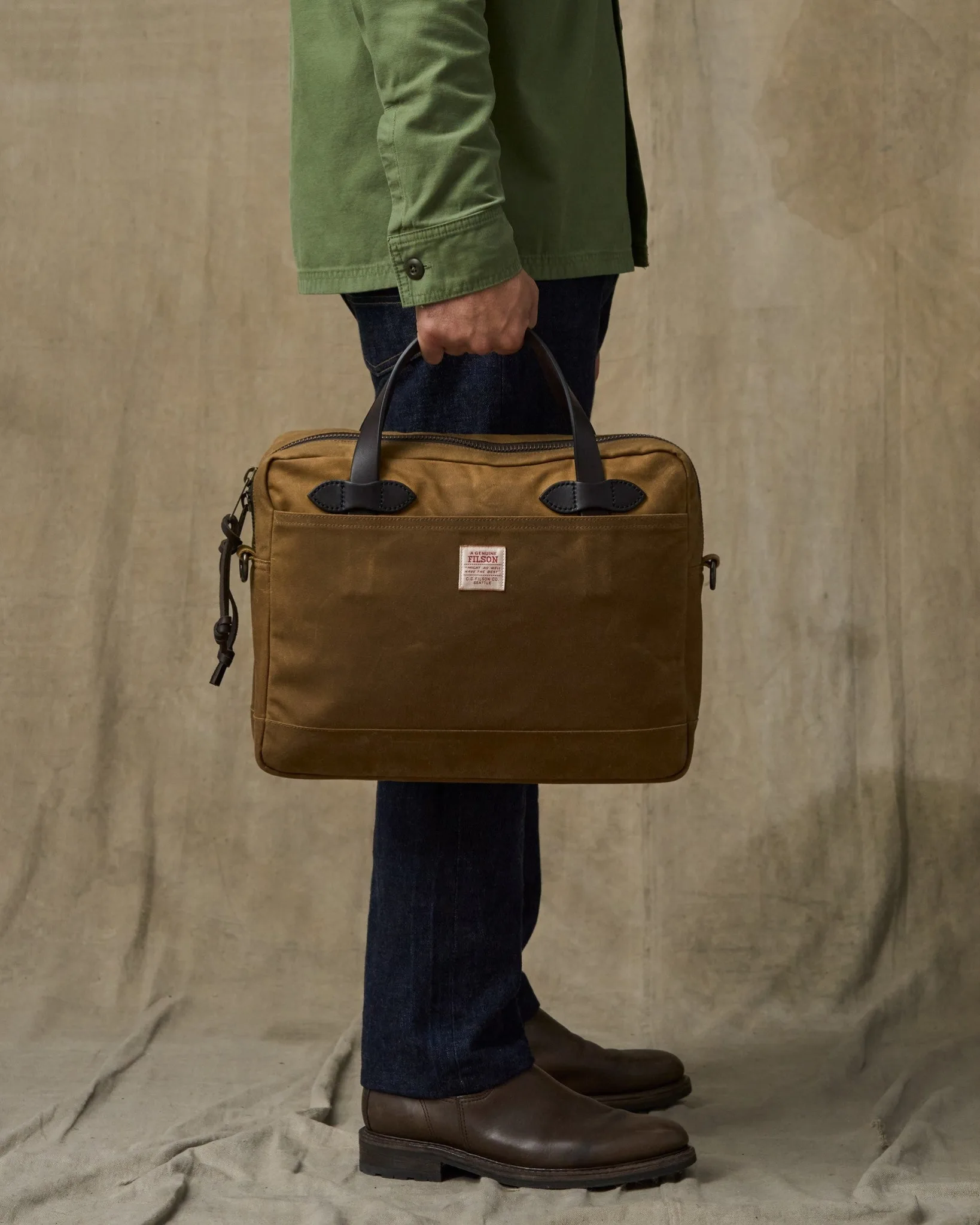 我們的 錫布輕便公事包 (Tin Cloth Compact Briefcase) 設有加厚保護層,可收納最高 15 吋的筆記型電腦或平板電腦。前方收納袋採全寬設計,便於存放文件;後方口袋則配有按扣以確保物品安全。主隔層選用耐用度極高的 YKK 重型金屬拉鍊,足以提供一輩子的服務。
