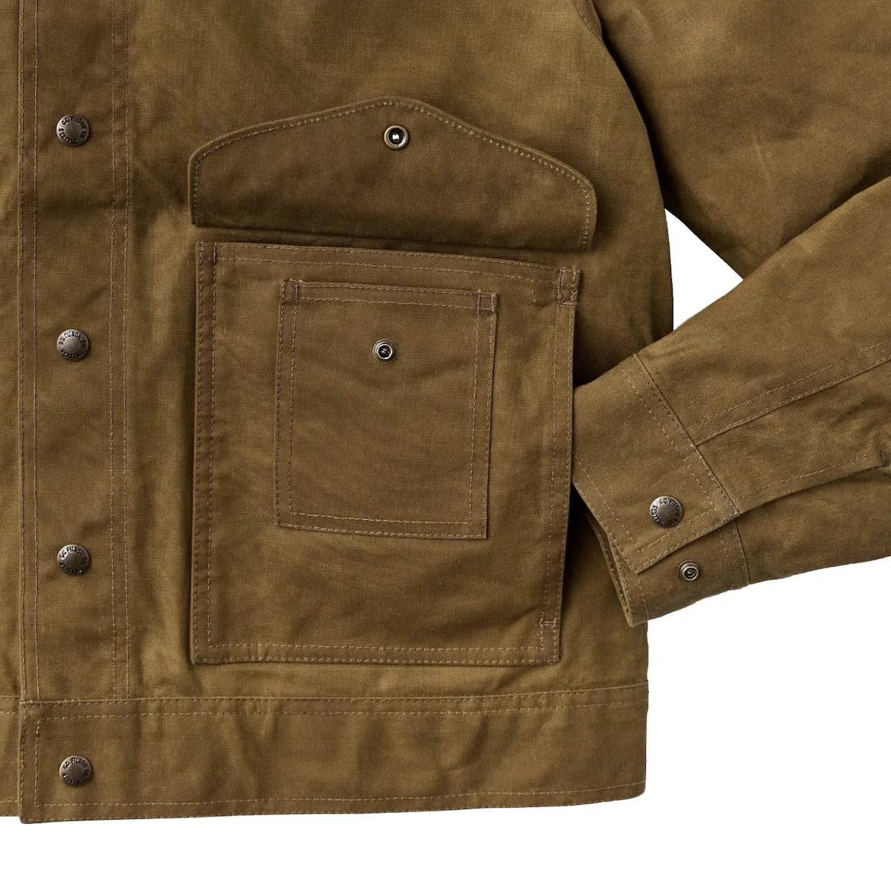 夾克軀幹內襯採用輕量帆布罩布 (Cover Cloth),袖口則襯有聚酯纖維,方便與內層衣物疊穿。正面配有兩個大容量的工裝袋(Cargo pockets),採用按扣翻蓋確保安全,並巧妙隱藏了襯有阿拉斯加嚮導法蘭絨 (Alaskan Guide Flannel) 的暖手口袋。領口的羊毛襯裡在翻起時能提供額外的保暖,阻擋寒風侵襲。剪裁長度及髖部,不僅方便拿取工具帶上的物品,也能防止坐下時夾克向上捲縮。